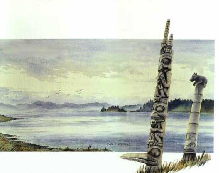Totem Poles at Masset. Neither of these poles remain at the village site having been removed and placed in museums. The short one with a bear on top is a memorial pole the other with the raven on the bottom is a house frontal pole.
