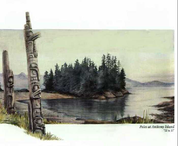 The pole within the picture is still standing at Anthony Island, it had an Eagle on it, and it is a burial pole. The taller pole is a house frontal pole and has an Eagle at the top underneath is a Raven, Beaver then at the bottom a Bear eating a man.